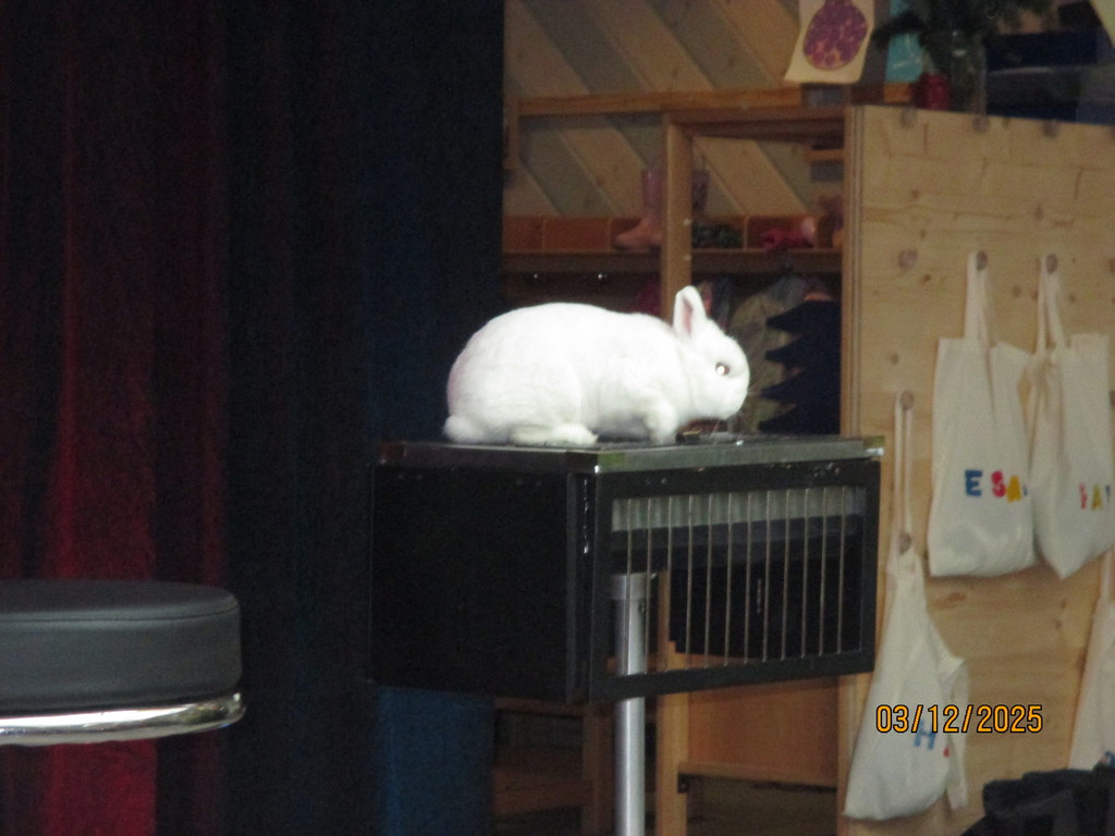 Der Zauberer hatte sogar echte Tiere mit- Kaninchen, Flocke den Hund Max und die Taube Erich. Die Kinder waren fasziniert und konnten die kleinen Helfer aus nächster Nähe beobachten.